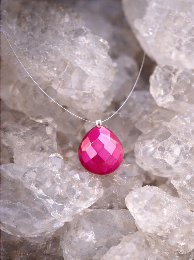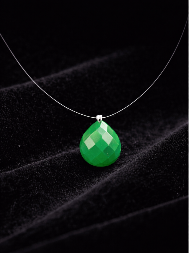 Le Montage : L’audace du bijou réside dans son montage sur un fil de crin. Presque invisible sur la peau, ce fil robuste permet à la pierre de s’émanciper de toute monture classique. La briolette semble flotter au creux du cou, comme une goutte de rosée suspendue.
