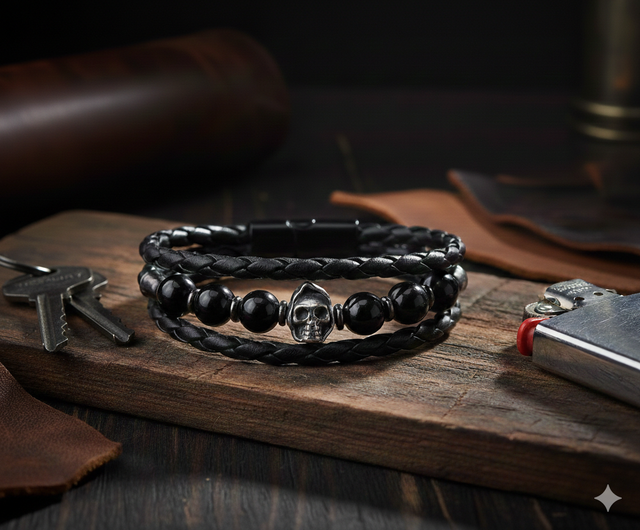 Affichez un style audacieux avec ce bracelet multi-rangs, mariage parfait entre l'esthétique rebelle et la force des minéraux. Conçu pour ceux qui ne craignent pas d'affirmer leur caractère, ce bijou allie élégance sombre et protection.