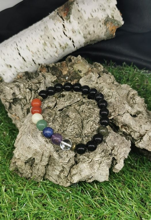 Alliez la force brute de la terre à l'harmonie des énergies. Ce bracelet combine l'Obsidienne noire, pierre de protection suprême, aux pierres naturelles des 7 chakras.