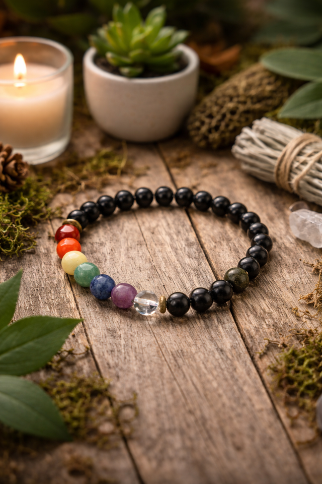 Bracelet Équilibre & Bouclier - 7 Chakras & Obsidienne