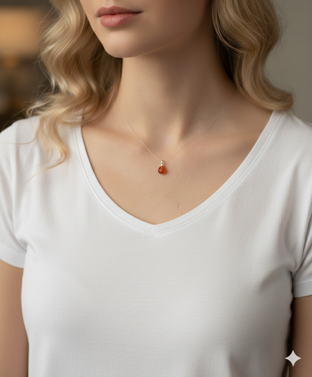 L'élégance réside souvent dans l'art de la discrétion. Cette briolette en cornaline en est la preuve éclatante : une création où la pierre semble ne faire qu'un avec celle qui la porte.